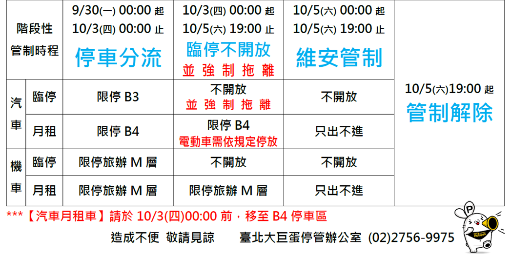 請依指定樓層及區域停放,10月5日活動當日車輛採【只出不進】,並請電動車請依現場指示牌停放,感謝配合。