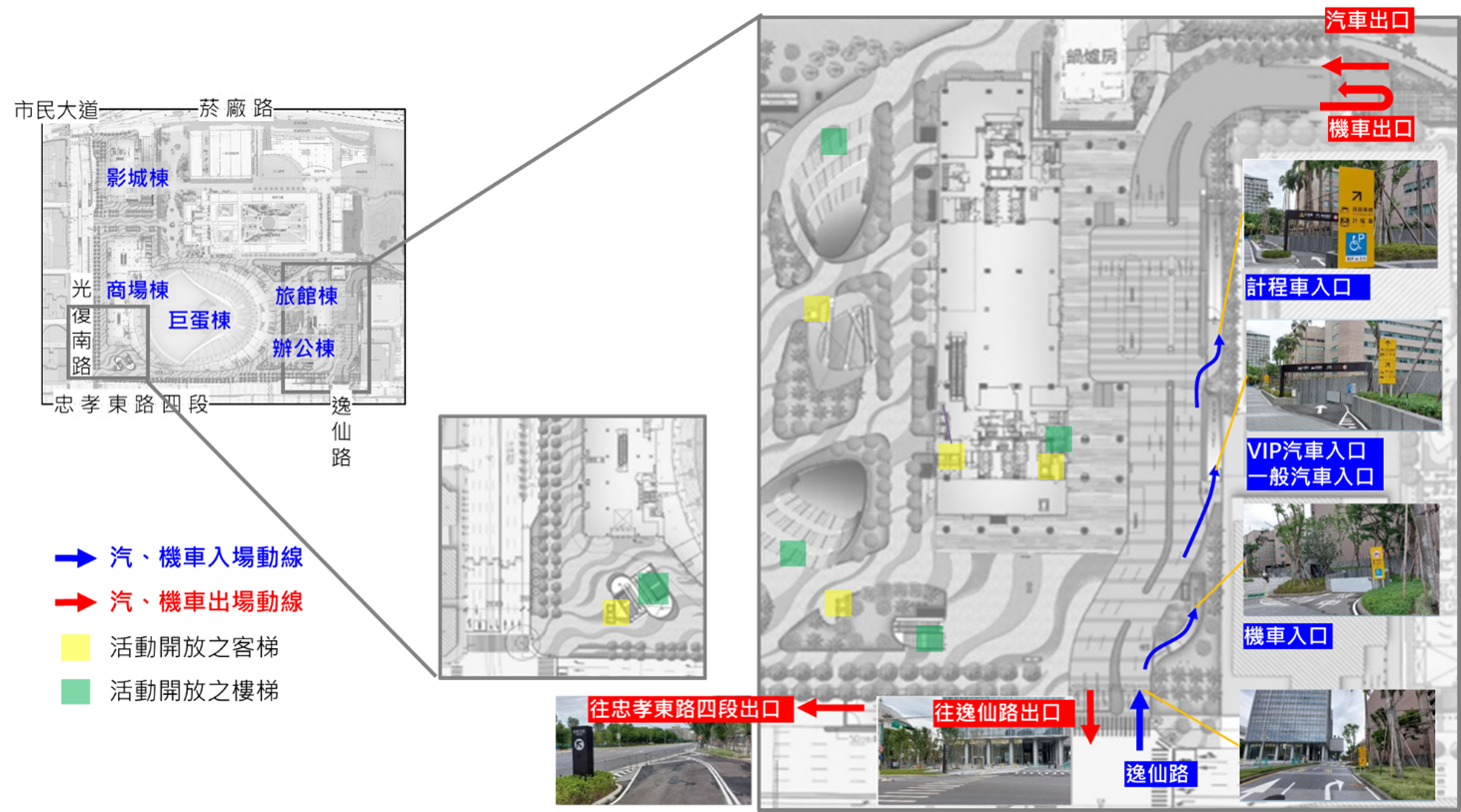 2023年第30屆亞洲棒球錦標賽活動期間,園區計程車排班區請於辦公棟入口搭乘電梯或步行樓梯至B1F計程車排班區搭乘。入口規劃動線請參考右側圖示。